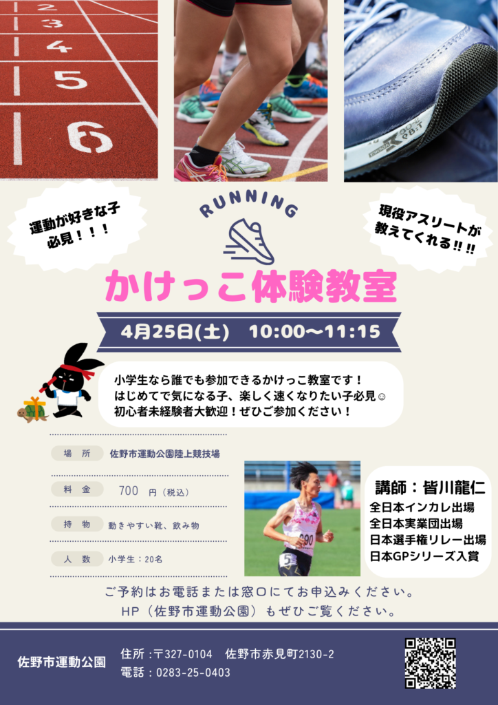 4/29(水)より 佐野市運動公園陸上競技場(清酒開華スタジアム)にて【かけっこ体験教室】を開催いたします♪