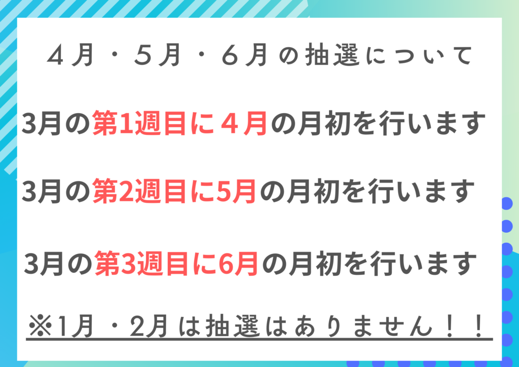 以降はその月の3営業日に3ヶ月後の予約受付を行い。5営業日に抽選結果発表となります。