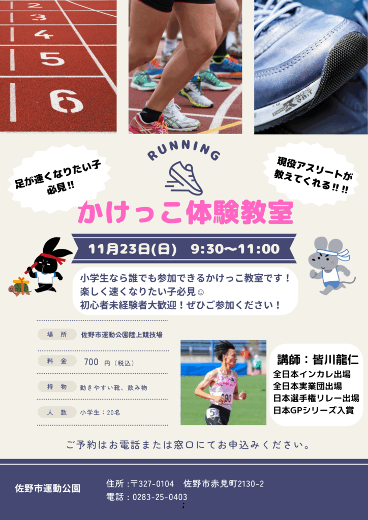 11/23(日)より 佐野市運動公園陸上競技場(清酒開華スタジアム)にて【かけっこ体験教室】を開催いたします♪